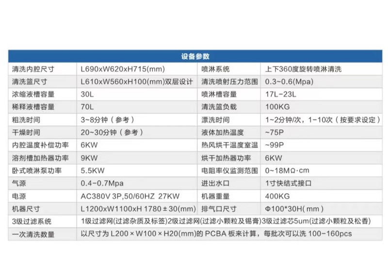 机器以电力、气为能源,人工方式将PCBA 放入清洗室内,设定好触摸屏中的清洗、漂洗、干燥及其他相关参数后,点击开始运行,PCBA 会被自动的清洗、漂洗和干燥。当设定的清洗工艺流程结束后自动停止运行,并且复位,以便实现下次的工作流程。本机器非常方便作业人员清洗 PCBA,大副提高生产效率和品质.属于新型、高性能全自动清洗设备。设备使用水基型的液体或 DI 水作清洗剂,无任何安全隐患,并且对人员无伤害。